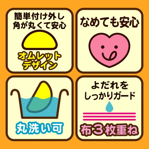 電車の中のグズリに効く! ! 抱っこひも用よだれカバーが誕生! ! 業界初! 厳選おもちゃつき! オムレットデザインよだれカバー! 「ノンキャラ良品シリーズ」の研究を活かし、赤ちゃんごきげん要素がつまったおもちゃをつけ、デザインにも気配りした商品となっています。 【特徴】 1ワンタッチで取り付け外しが可能でラクチン! 2角が丸く、赤ちゃんの顔に当たっても痛くない、目に入りにくい安心設計! 3丸洗いOK! 4布3枚重ねでよだれをしっかりガード! 5右でも左でも取り付け可能なので、赤ちゃんの向きグセにも対応!
